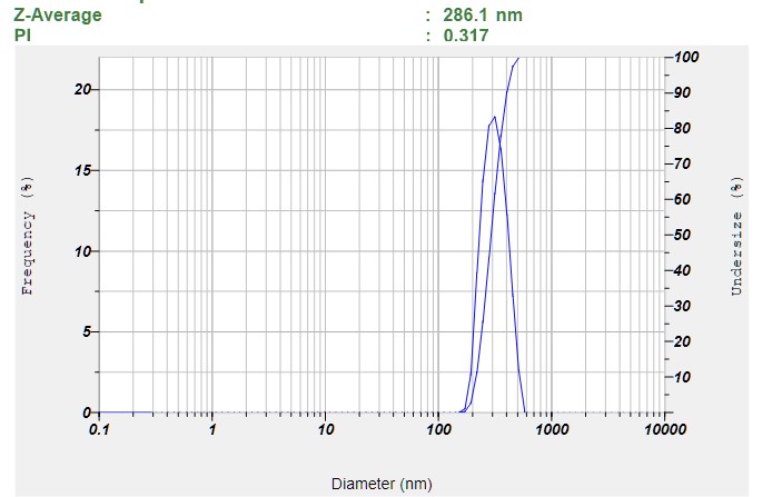 NLCs loaded with TA were developed using solvent diffusion method in aqueous system. The formulated NLCs sizes were analyzed using DLS, results revealed that presence of NLCs mean diameter of optimized batch was about 286±0.07 nm, maximum NLCs lie between size ranges of 200-500 nm, and polydispersity index 0.317. The 0.2 % surfactant concentration showed the lowest particle size. This could be explained by the decrease in surface tension by increasing the surfactant concentration, which facilitates the size reduction and stabilizes the formed NLCs with inhibition of aggregation.