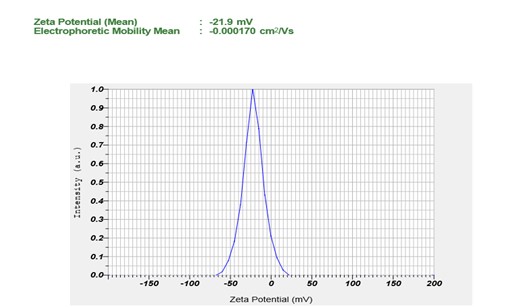 Moreover, PDI was significantly decreased by increasing the concentration of surfactant. These results were consistent with increasing the surfactant concentration leads to a significant decrease in the NLCs size and PDI. The zeta potential of optimized batch B6 was obtained-21.91±0.05 mV which corresponds to stability of formulations. The zeta potential in the range of-14.30±0.03 to-21.91±0.05 mV was obtained of all prepared batches. Patwekar SL et al. reported that, high zeta potential values indicate the physical stability of the prepared NLCS with low probability of aggregation and crystal growth [6]. Particle size, Zeta potential of optimized batch showed in fig. 1 and 2.