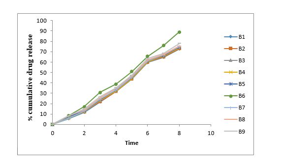 Fig. 3: % Cumulative drug release of drug. Error bars were omitted, n=3