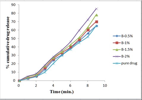 Fig. 5: % cumulative release of hydrogel of batch 0.5% to batch 2% and pure drug gel. Error bars were omitted, n=3