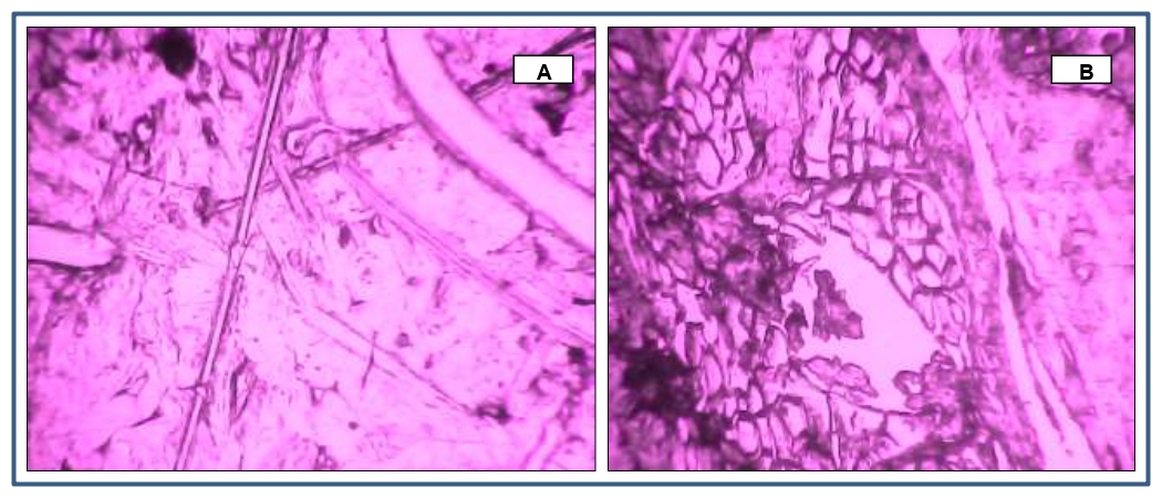 The flux was used to gauge the permeation of TA through the skin. Highest flux was obtained for the batch 2% hydrogel formulation in comparison to the pure drug penetration enhancers. The molecular size and lipophilic nature of complex produced maximum flux by maximizing the amount of free TA available for permeation. The hydrogel formulation showed the release of 87.52% at the end of 9h. In vitro drug release of pure gel was 70.23±0.07% within 9 h. It was observed that the NLC hydrogel shows flux was higher compared to the other formulations. The 2% batch shows that permeability coefficient and Flux(J) were 0.0155 and 5.455±0.43 respectively. Histological study of permeation of pure drug gel (A) and 2% hydrogel (b) magnification at 40X shown in fig. 6.