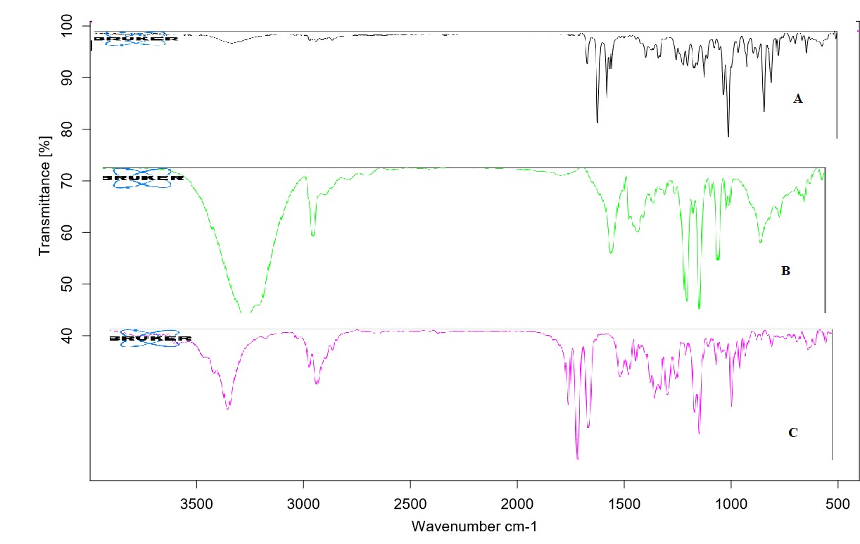 Fig. 7: Overlain of FTIR spectrums of A) Drug B) NLC, C) physical mixture