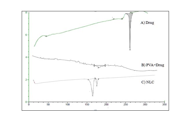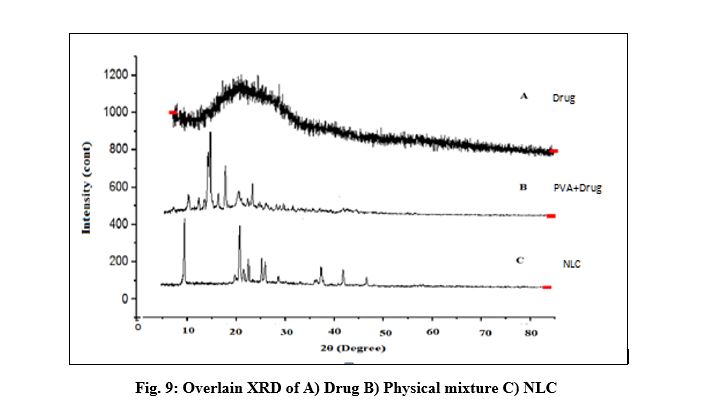 X-ray diffraction has been used to analyze potential changes in the inner structure of NLCs. The results indicated that XRD spectrum of NLCs batch shown reduced peak intensity it leads to reduced crystallinity. It revealed that the there was no such interaction observed in excipients and polymer used. In XRD analysis all peak intensity was observed in decreasing order, therefore the NLCs formulation shows decrease in crystallinity. Furthermore, maintenance of the initial crystalline state is advantageous for long-term stability. The overlain of diffraction spectrum of XRD of A) drug B) physical mixture C) NLCs shown in fig. 9.