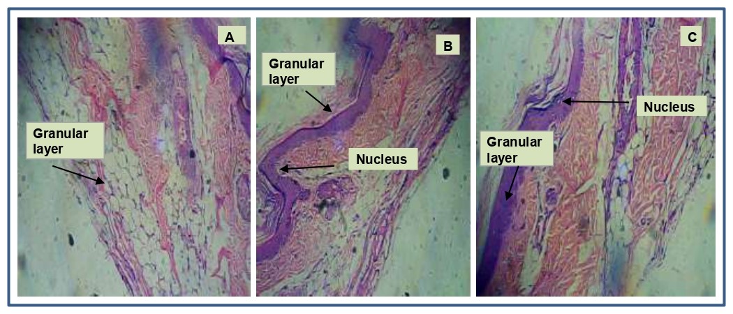 Fig. 11: Longitudinal histological sections of Albino rat tail skin at 40X control (A), Cotrima cream (B) and TA-NLC loaded hydrogel (C)