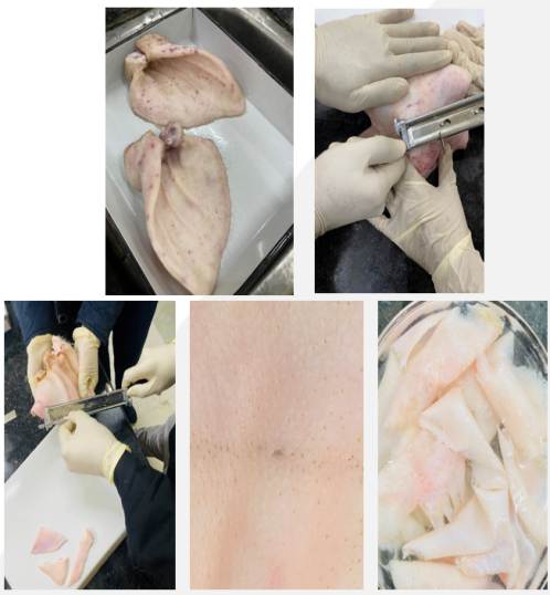 Fig. 2: Preparation of porcine skin samples and mounting on modified franz diffusion assembly