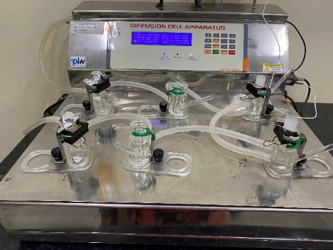 Permeation of Ɣ-Oryzanol across porcine ear skin was calculated using the Modified Franz diffusion cell apparatus. The volume of the donor compartment present in the test apparatus was found to be 3.319 cm3 and the area was calculated which came to be around 1.3263 cm2. Phosphate buffer pH 8 (60%), Iso-Propyl alcohol (40%) and Labrasol (0.5%) were used as receptor media and the temperature of this media was maintained at 37.5 ℃ throughout the studies with water circulation and stirring at fixed RMP [26, 27].