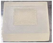 Form Labs' Dental SG biocompatible Class I resin was chosen as the printing material. The stereolithography (SLA) printer, used by Adroitec Pvt. Ltd. to manufacture the arrays, offers high-resolution capabilities (25 and 140 microns for z and x axes, respectively).
