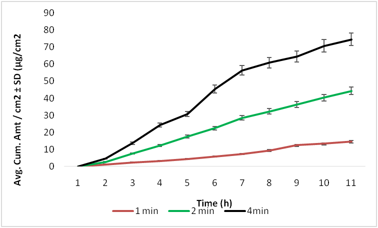 Fig. 9: In vitro permeation profile of Ɣ-Oryzanol through microneedle-treated porcine ear skin: Solid-MN 1 min, Solid-MN 2 min, and solid-MN 4 min (n=3, mean±SD)