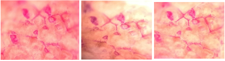 Pig-ear skin that was quickly gathered after pigs were slain at a nearby slaughterhouse was used for in vitro skin insertion research. Damaged skin was scraped from skin samples after they had been cleansed with cold water. The entire skin was meticulously separated from the underlying cartilage to generate full-thickness skin membranes. The skin was defrosted and sliced into 2*2 cm squares before the diffusion tests. Thumbtacks were used to secure the skin samples into a firm framework before the microneedle arrays adhered to their surface. The skin was physically compressed with microneedles for 30 seconds with force comparable to pressing an elevator button or a stamp into an envelope; then, the compression site was peeled off and exposed to a fluorescent dye for 1 minute. Skin samples that were treated for histological analysis had the remaining dye removed. Skin samples were fixed in 10% formalin, dried, and embedded in paraffin to create histology specimens [29]. To evaluate penetration depth, skin samples were stained with methylene blue dye and examined under an Olympus fluorescence microscope as shown in fig. 10.