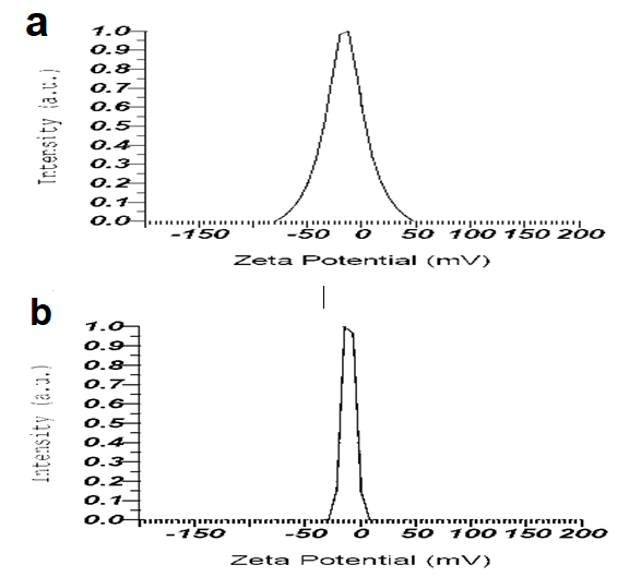 The electrical potential at the bilayer boundary is known as the Zeta potential of the particle and has values that typically range from 100 mV to-100 mV. The magnitude of the zeta potential can predict colloidal stability. Microparticles with a Zeta Potential value greater than+25 mV or less than-25 mV usually have a high degree of stability. Dispersions with low zeta potential value will produce aggregates due to inter-particle Van Der Waals attractions [37-42]. Zeta Potential Analysis is a technique for determining the surface charge of particles in a solution (colloid). Microparticles have a surface charge that attracts a thin layer of charge ions that is opposite to the surface of the microparticles.
