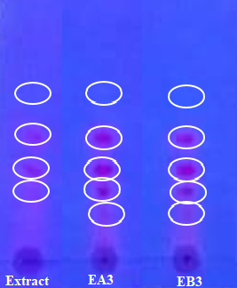 Fig. 2: TLC profile of S. alba leaves ethanol extract; EA3 = Eudragit E100 Formula (20%); EB3 = Ethocel Formula 10 cP (20%) under UV light 366 nm