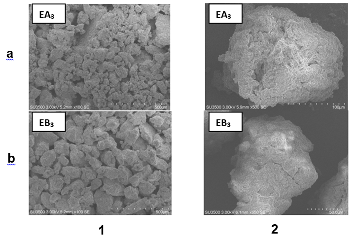 Fig. 3: SEM (Scanning electron microscope) Eudragit E100 and Ethocel 10 cP polymer microparticles at magnifications of 100x and 650x. a). Eudragit E100 (20%, EA3) and b). Ethocel 10 cP (20%, EB3), 1) magnifications of 100x and 2) magnifications of 650x