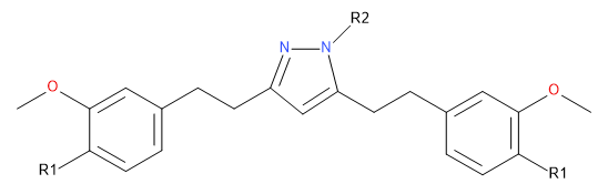 By lowering the number of samples needed for in vitro and in vivo experiments, in silico studies could provide useful research data and minimize drug development expenses [12]. The diketone groups were modified into pyrazole rings with various substitutions (R2). Similarly, the two hydroxyl groups were substituted with different groups (R1) (fig. 2). Supplementary material contains the structure of 168 THC derivatives and other related data. (Structure of substituted THC with substitutions represented as R1 and R2).