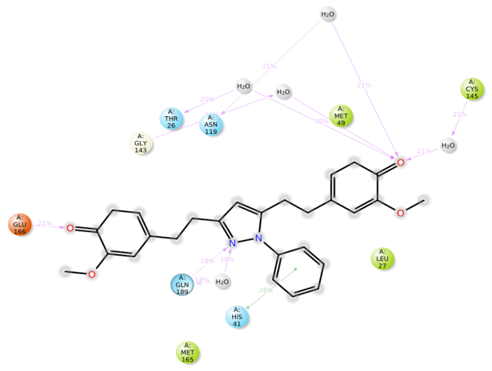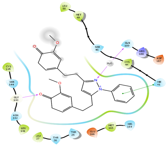 The presence of three hydrogen bonds with GLY143 and the ketone functional group, water molecule and the N atom of the pyrazole moiety, and water molecule and GLN 189 was revealed in fig. 3A, which had the highest docking score. A π-π interaction is observed between the benzene ring attached to the pyrazole moiety and HIE 41. Fig. 3B represents the binding of S21 with active site of 5R82.