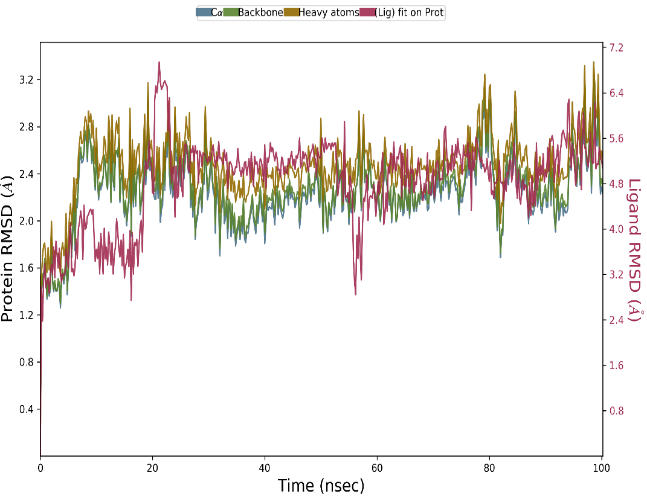 The stability, conformational variations, and underlying molecular interactions of Mpro protein (5R82) at the atomic level was examined using MD simulations at 100 nanoseconds. The specified temperature, pressure, and volume were controlled by simulation quality parameters during the MD simulations [17]. Studies were conducted using various conventional simulation parameters, including Ligand Root Mean Square Fluctuation, Ligand Root Mean Square Deviation, Protein-Ligand interactions, Total Energy, and Ligand Torsion Profile and Properties. Assessing the dynamics and stability of the protein and its interaction with compound S21 was the primary goal of MD simulation.