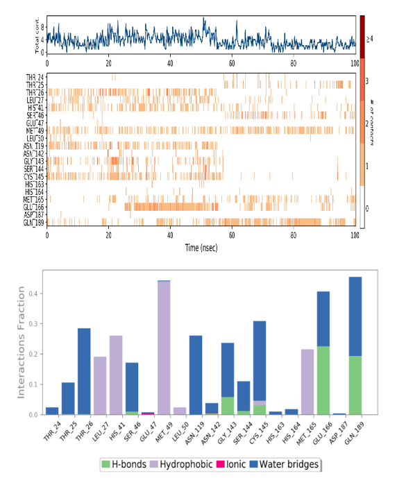 The local alterations along the protein chain can be characterised using the Root Mean Square Fluctuation. RMSF of the MPro protein in complex with S21 pattern of residue fluctuations were found to be similar from docked structure of protein ligand shown in fig. 3B and fig. 4A. Throughout the simulation time, proteins showed a rather stable structure without missing any significant interactions. To better comprehend the driving forces behind the stability of protein structure, intramolecular hydrogen bonds were examined. More intramolecular hydrogen bonds are a sign of protein rigidity [18]. In addition to many other characteristics indicated in the figures, the total energy required for stabilising Mpro state in complex with S21 was investigated. A timeline representation of the interactions and contacts shows the total number of specific contacts in which residues interact with the ligand in each trajectory frame as shown in fig. 4B.
