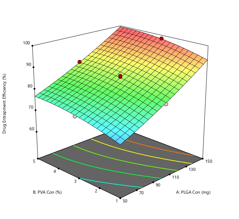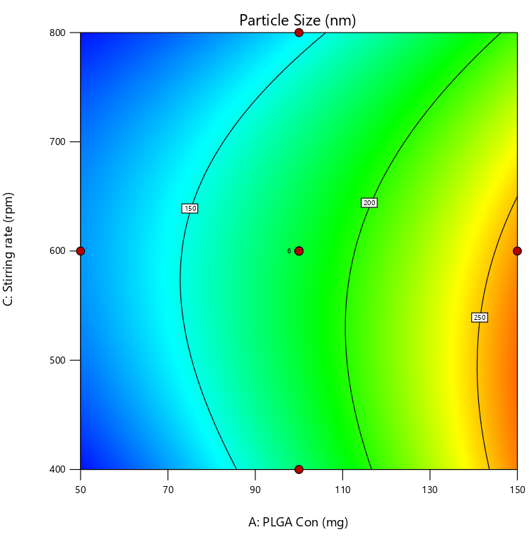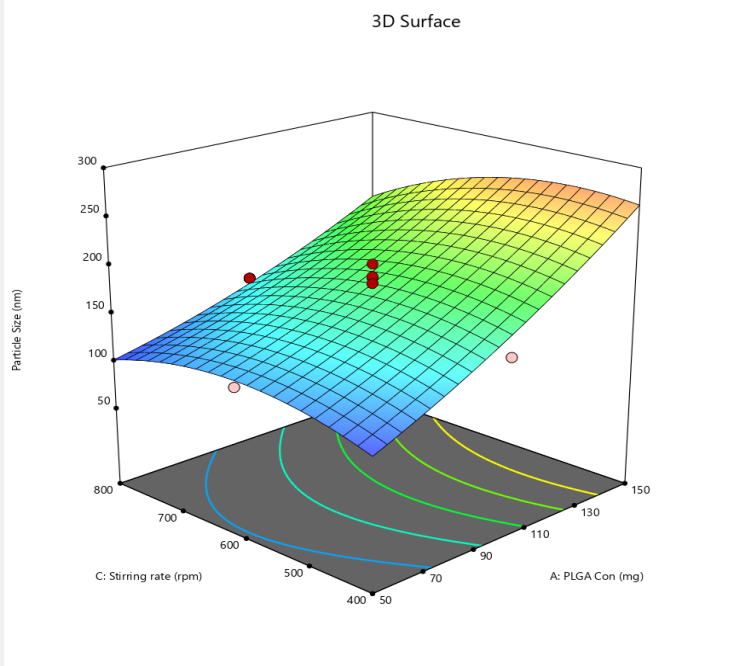 Multiple regression analysis was employed to study the effects of factors and their interactions on observed responses by means of polynomial models. Equation 1 represents a second-order polynomial equation, where R is the calculated response connected with each critical formulation attribute level combination. b0 is the arithmetic mean response of all experimental runs. The polynomial terms b1, b2, b3 are coefficients of main effects A (PLGA concentration), B (PVA concentration), and C (stirring rate) to understand the average result of changing one factor at a time from its low value to its high value. The polynomial terms b12, b13, b23 are coefficients of interaction terms AB, AC, BC, which describe the change in response when two factors are altered simultaneously. To study the nonlinearity of the model, b11, b22, and b33 are required. Each coefficient carries a mathematical sign. A positive sign indicates a synergistic effect and a negative sign represents an antagonistic effect.