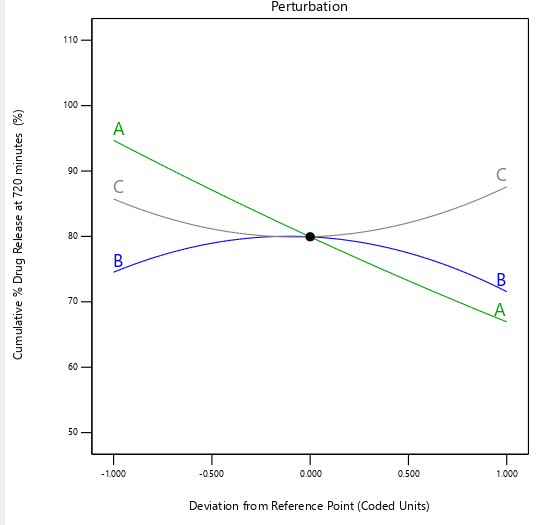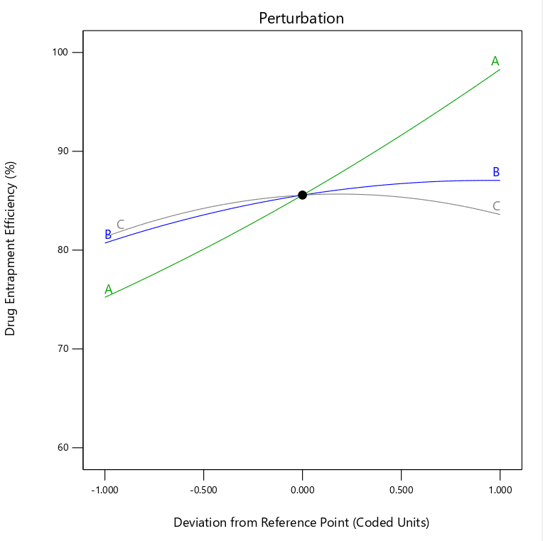 Based on comparisons of statistical parameters, the best fit model was selected. For each response, ANOVA was calculated to determine the significance of each parameter selected for the study by using probability value (p-value). Perturbation plots, 3D Response surface plots, and 2D contour plots were analysed to visualise the effects of critical formulation attributes and their interactions on responses [18, 19].