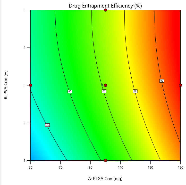 Results: The numerical optimization process predicted the level of PLGA concentration as 69.96 mg, PVA concentration as 4.99%, and stirring rate as 799 rpm for the optimised formulation. The low percentage of relative error for the optimised formulation confirms the validation of the model. The optimised formulation had a 77.65% entrapment efficiency with a particle size of 109.7 nm and the percent cumulative drug release showed 86.46% drug release over 720 min. The drug release was found to follow first-order release kinetics with anomalous non-Fickian diffusion kinetics.