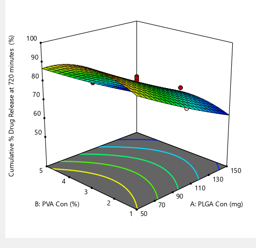 A 3 factor, 2 level, the face-centered central composite design was employed to optimise formulation and process parameters for the preparation of favipiravir-loaded PLGA nanoparticles. All three variables were taken at two levels, high and low, which were represented by coded values of+1 and-1, respectively. Six runs of replicates were performed at the centre point coded 0 to estimate the overall curvature effect and experimental error. Design-Expert software (Version 13.0.12.0 Trail, Stat Ease Inc, USA) was employed for the generation and evaluation of the 20 experimental runs given in table 1. For optimization of favipiravir nanoparticles, critical formulation attributes were identified to be the polymer (PLGA) fraction, the concentration of stabiliser (PVA), stirring rate, and desired critical quality attributes like particle size (R1), drug entrapment efficiency (R2), and cumulative percentage drug release at 720 min (R3) were selected [16, 17].