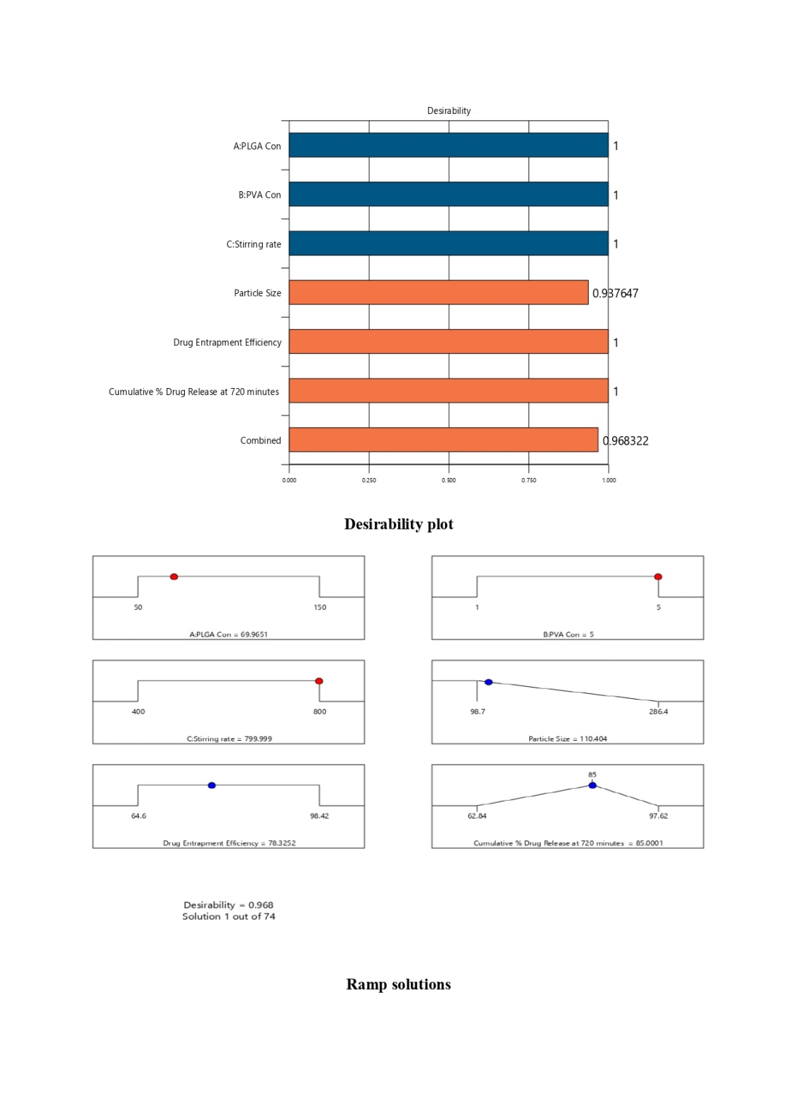 A desirability approach was used to develop an optimised formulation with desired responses by employing numerical and graphical optimisation techniques. For calculating desirability "D", the desired goal like minimum, maximum, target, or the in-range value was chosen for each response, and the goals were combined into a simultaneous objective function to yield a desirability plot. An optimised formulation with optimised conditions was derived with the help of a desirability plot and ramp solutions. Optimised formulation experimental values for responses were correlated with the predicted values generated by the Design-Expert software (Version 13.0.12.0 Trail, Stat Ease Inc, USA) to determine the percentage of predicted error. The percentage predicted error should be less than±2% to be within the acceptable limits [20, 21].