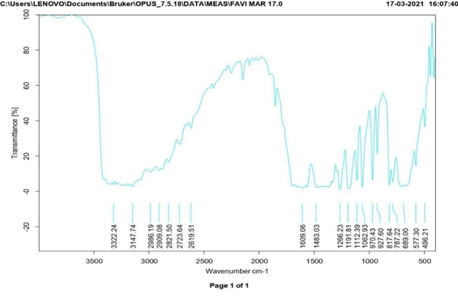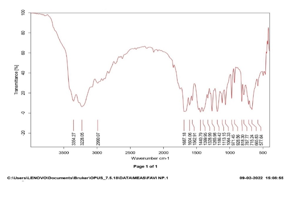 To investigate the stability of favipiravir within polymeric materials, the FTIR spectra of pure drug favipiravir and a promising formulation were recorded using an IR spectrophotometer and the pressed pellet technique. Samples were prepared by pressing them with KBr into pellets. In this study, the spectra obtained for pure favipiravir and a promising formulation were scanned between wave number regions of 4000-400 cm-1 [22].