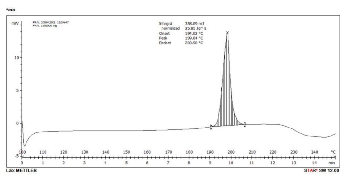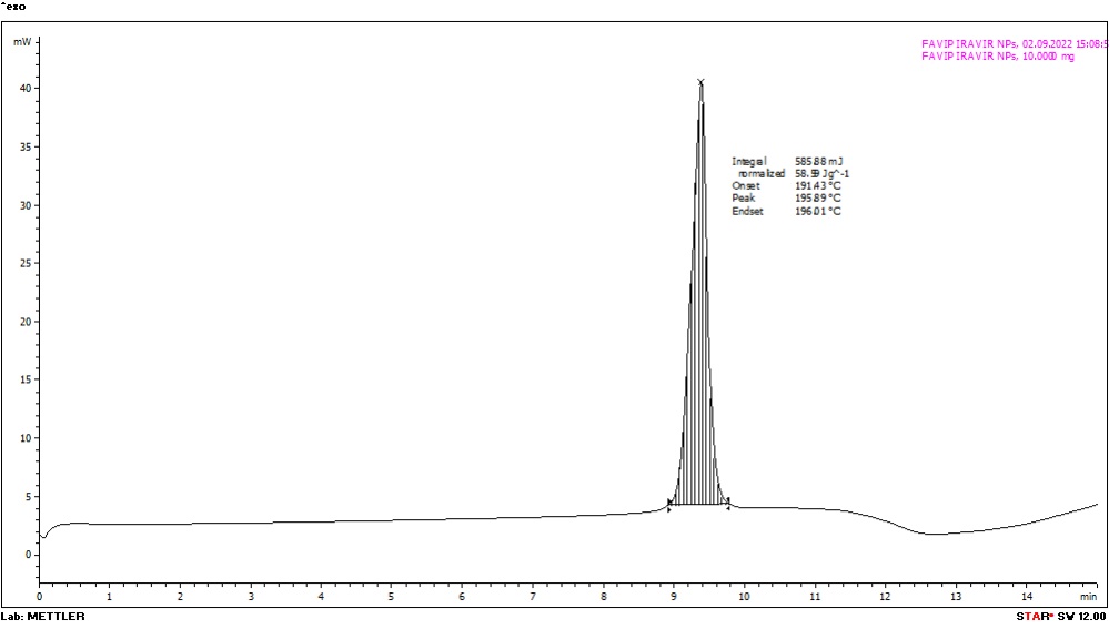 The thermal behaviour of pure favipiravir and the optimised formulation were analysed using a differential scanning calorimeter. 10 mg of sample was placed in aluminium crimp cells and subjected to DSC under constant purging of nitrogen at 20 ml/min. Thermograms were recorded by heating samples from 100 to 250 °C at a heating rate of 10 °C/min with an empty aluminium pan as the reference [23].
