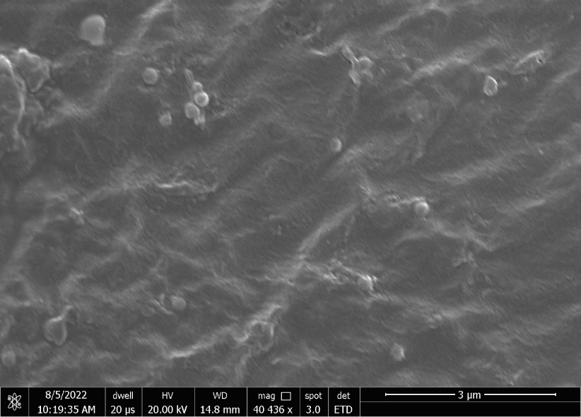 The morphological characteristics of the favipiravir-loaded PLGA nanoparticles were determined by performing analysis using scanning electron microscopy (FEI Quanta 250 FEG, USA). For SEM analysis, favipiravir-loaded PLGA nanoparticles were positioned onto a brass stub and sputtered with gold using gold coating-Quorum, later fixed into a sample holder, then examined under low vacuum (1023 mm HG) and photographed randomly [24].