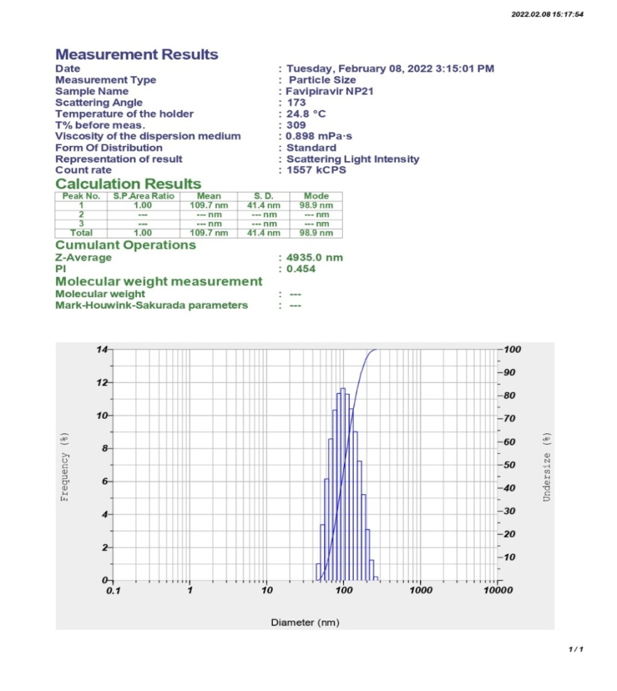 The particle size was determined for all the prepared favipiravir-loaded PLGA nanoparticles. The mean particle sizes of all formulations (FNP01-FNP020) were found to be in the range of 98.7 to 286.4 nm. The mean particle size of optimised formulation FNP021 was found to be in the size range of 109.7 nm as shown in fig. 10 with a polydispersity index of 0.454 and a zeta potential of-17.2 mV as represented in fig. 11. It is reported that nanoparticles with negative zeta potential are less prone to aggregation and indicates good stability [47].