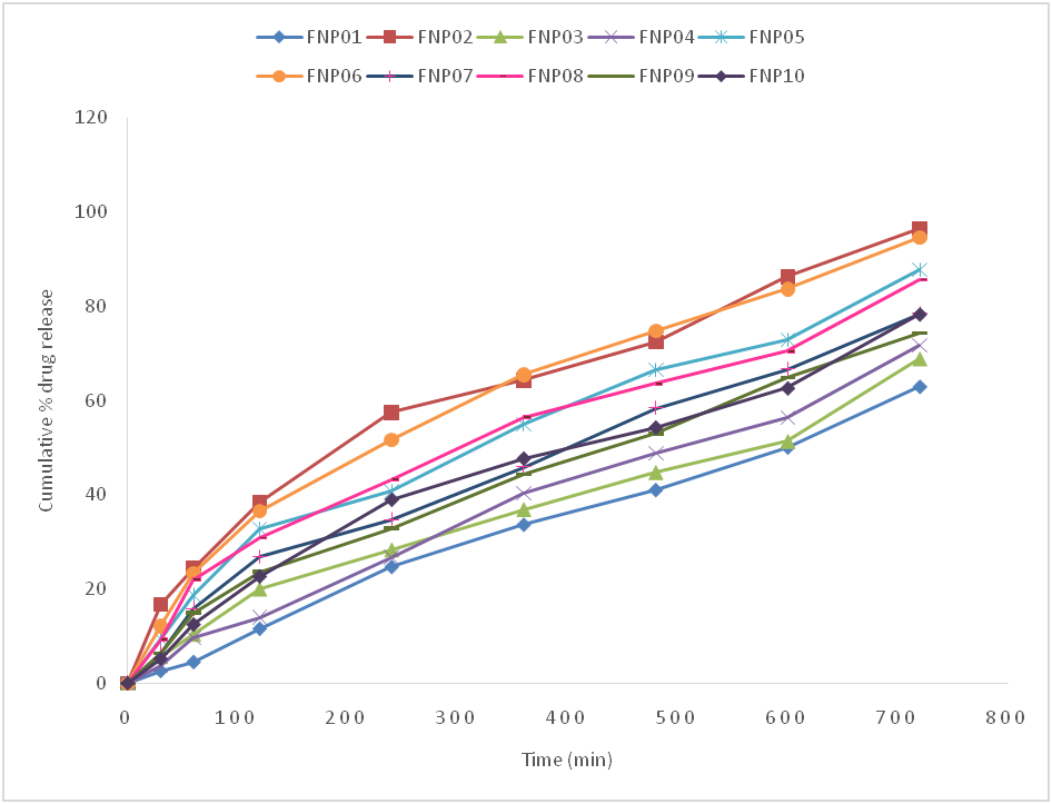 Fig. 12: Cumulative percentage drug release of favipiravir from FNP01 to FNP010 formulations