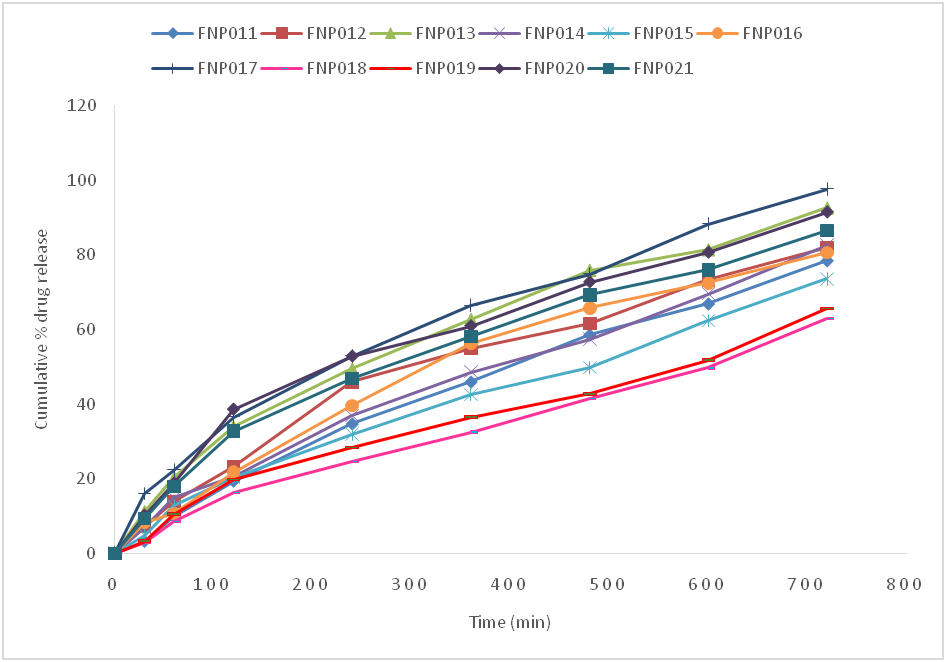 Fig. 13: Cumulative percentage drug release of favipiravir from FNP011 to FNP021 formulations