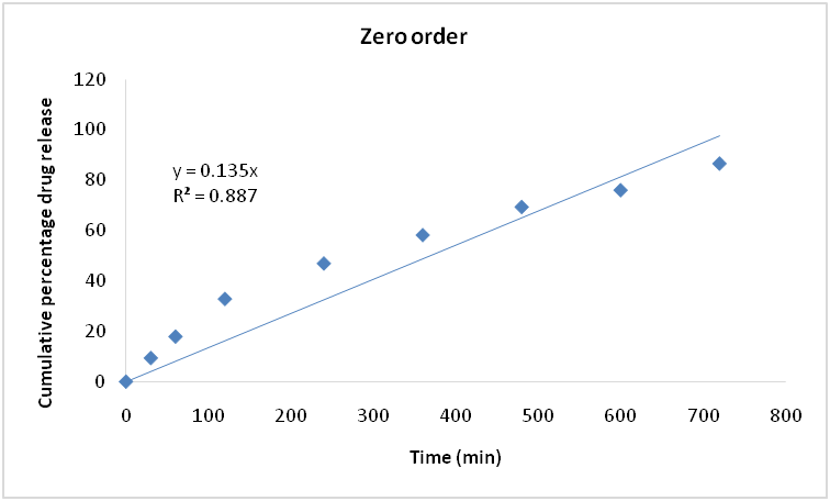 To understand the mechanism and kinetics of drug release, the in vitro drug release data obtained was fitted into various mathematical kinetic models such as zero order, first order, and the Higuchi and Korsmeyer peppas model. On the X-axis and Y-axis, the zero-order (cumulative percentage of drug released Vs time), first-order (log cumulative percentage of drug retained Vs time), Higuchi (cumulative percentage of drug released Vs square root of time), and Korsmeyer peppas models (log cumulative percentage of drug released Vs log time) were considered [29].