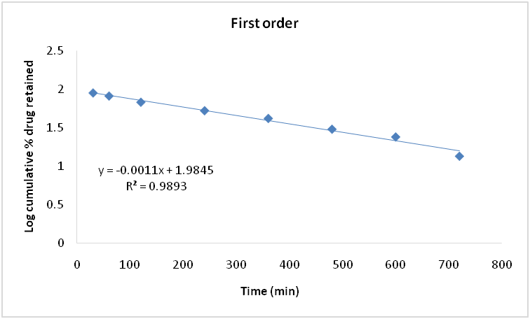 | Time (min) | Cumulative % drug release | Cumulative % drug retained | log Cumulative % drug release | log cumulative % drug retained | log time | √T |