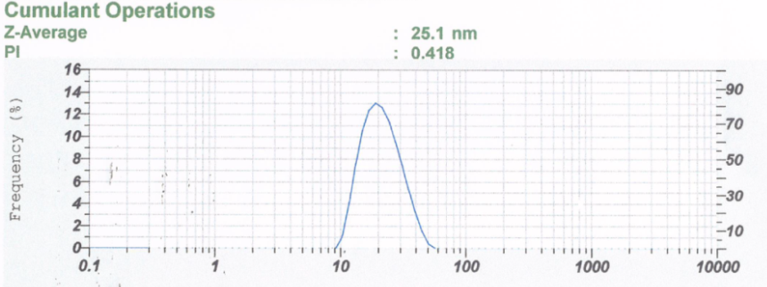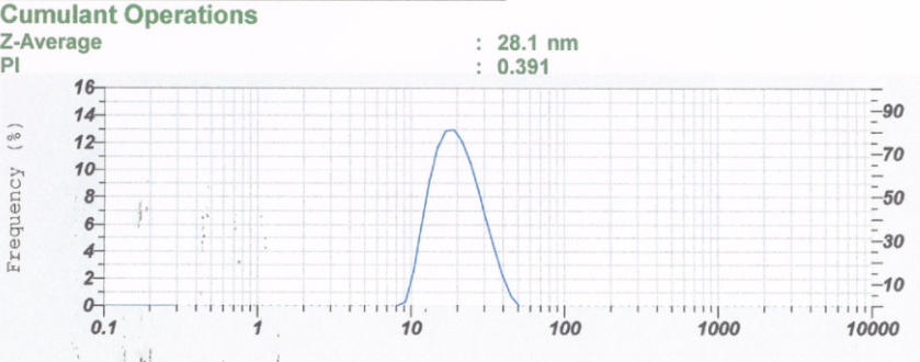 The particle size of the preparations was measured using a particle size analyzer (PSA) with the dynamic light scattering (DLS) method. The eight formulations and the one formula with the highest transmittance value (formula b) were measured in triplicate. As shown in fig. 1–fig. 3, the obtained size of the one formula with the highest transmittance value is 25.1, 28.1, and 31.7 nm (28.3±3.305), the measure was acceptable to be considered a nanoparticle because it was within 20–500 nm [32]. Meanwhile as shown in fig. 1–fig. 3, the polydispersity index (PDI) value obtained 0.418, 0.391, and 0.394 (0.401±0.015). The PDI values were considerably low, indicating good monodispersity and good stability. The PDI value reflects the distribution and uniformity of the oil droplets. PDI value for oral nanoemulsion formulation is less than 0.5, indicating the uniformity of droplet size distribution and affirming their homogeneity, as previously reported [33]. As shown in table 5, the eight formulations were categorized as nanoemulsions because the average droplet size and PDI value were accepted within the range. Furthermore, based on particle size and PDI value, formula b was selected as an optimized formulation for further studies.