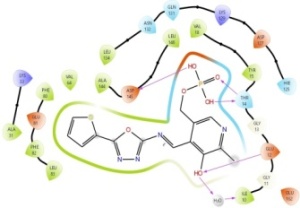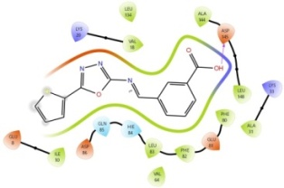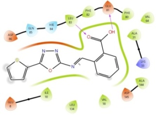 Recently, drug discovery and design had raised a great challenge due to the cost and efforts made to advance the drug development process. Computational approaches are rapidly growing and playing a significant role in this process because they provide ways to avoid loss of time, cost, and effort. Docking is one of these techniques, which anticipates the conformation and orientation of ligands within the active site of the target. Docking studies are aimed at proper structural modeling and exact knowledge of the activity of compounds [13]. The structures of nine 5-(thiophen-2-yl)-1,3,4-oxadiazol-2-amine derivatives were designed based on a literature review made by our team.
