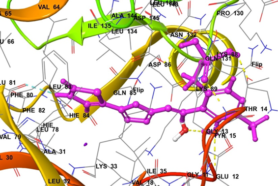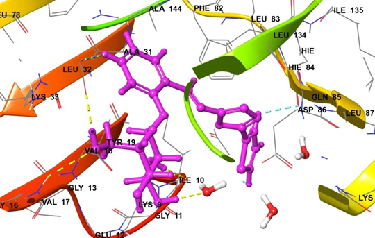 Inside the active site of the target protein, compound P-1 interacts with and binds to different amino acids. These interactions are mainly hydrogen bonds and hydrophobic Interactions, precisely there are five H-bonds between ASP145 with a hydroxyl group, THR14 with a hydroxyl group and an oxygen atom, GLU12 with a hydroxyl group, and ILE10 with a hydroxyl group through one water molecule in addition to the hydrophobic interactions that occur with surrounding amino acids (LEU83, PHE82, GLU81, PHE80, VAL64, ALA144, ASP145, LEU148, VAL18, TYR15, THR14, GLY13, GLU12, GLY11, and ILE10) as illustrated in fig. 2.