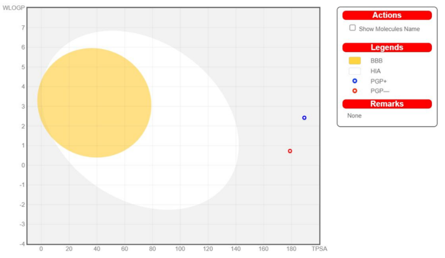 BOILED-Egg illustration of the two highest scoring molecules is presented in fig. 4, it shows that both compounds cannot penetrate the BBB and it is predicted to have low GIT absorption. Compound P-1 (blue dot) can be removed from the central nervous system (CNS) by P-glycoprotein while compound P-5 (red dot) is not a substrate for P-glycoprotein. TPSA which stands for Topological Polar Surface Area is an essential descriptor of the drug transport process such as the intestinal absorption and bioavailability of orally administered drugs, it represents the total contributions of polar atoms such as nitrogen, oxygen, and their attached hydrogen to the molecular surface area [24], molecules with a TPSA>140 Aᵒ are thought to have poor oral bioavailability [25]. Another important measure is the Lipinski rule of five which is developed to describe drug-ability and set oral bioavailability guidelines, it states that a drug should have lower than five hydrogen bond donors, an octanol-water partition coefficient log P lower than 5, ≤ 10 hydrogen bond acceptors and molecular weight (M. Wt.) ≤ 500 to be given orally [26].