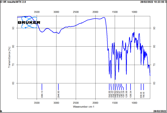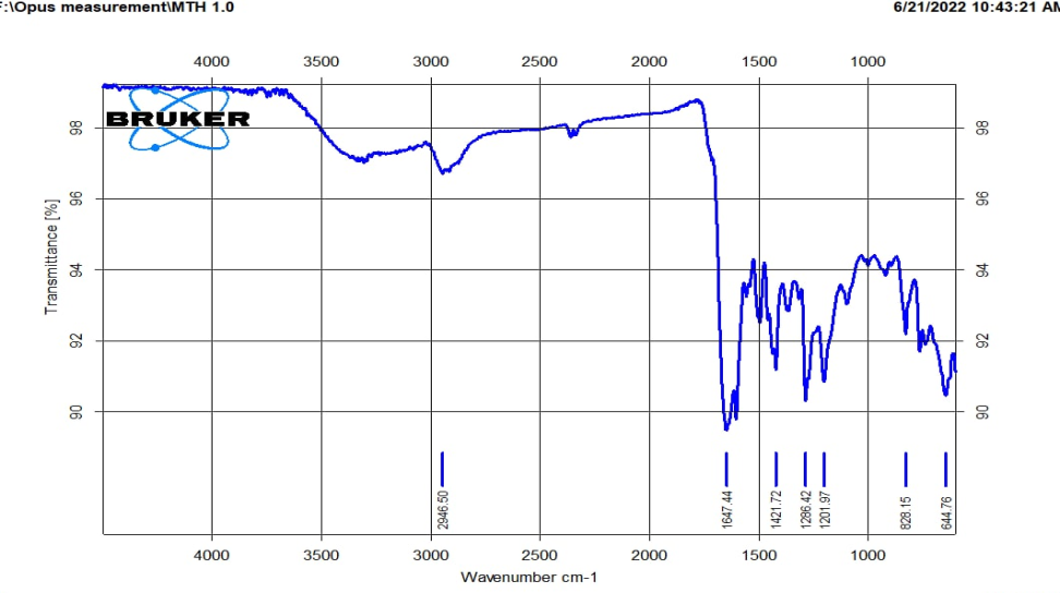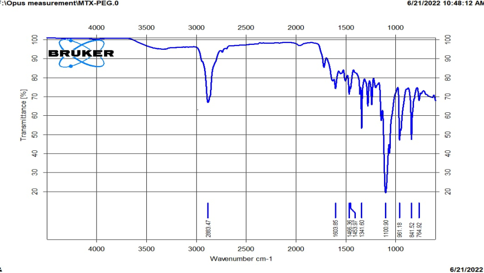 Fourier-transformed infrared spectroscopy (FTIR) was used to investigate the purity of methotrexate as well as the possible interactions between MTX and PEG 4000 and PVP K-30 [19].
