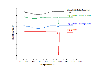 DSC thermograms of pure RG with Eudragit RSPO, HPMC K-100M and solid dispersion are shown in fig. 1. With Eudragit RSPO and HPMC K-100M, pure RP showed a similar peak at about 137 °C that was comparable with the melting point of RG. Conversely, the RG peak showed a considerable drop and no similar peaks were seen in the solid dispersion, indicating that the drug had changed from its crystalline state to an amorphous state.