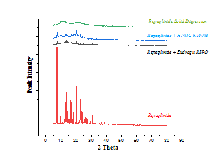 The XRD diffractograms of pure RG with Eudragit RSPO, HPMC K-100M, and RG-SD (fig. 2) were studied. The diffraction pattern of pure RG shows the different peaks at 2 Theta = 7.60 20.26, 22.90, 23.96, 30 and 33. The crystal character of the pure RG was amply demonstrated by these peaks. Furthermore, a significant decrease in characteristic peaks suggests the presence of amorphous forms.