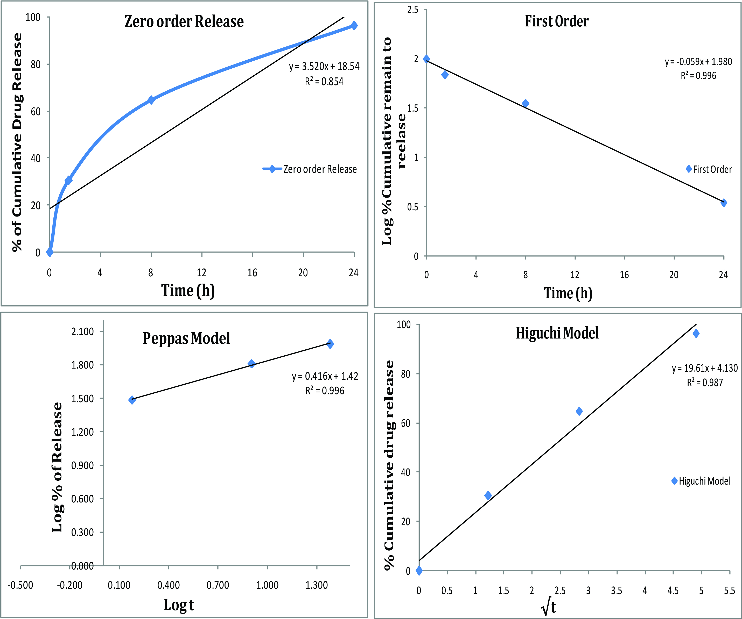 To identify the best mathematical model for the determination of the kinetics of drug release [19] and mechanism of drug release from RG-GRF Tablets, several models can be investigated like Zero-order, first order, Higuchi and Korsmeyer–Peppas equation. In the current investigation, the drug release data obtained from the optimized RG-GRF tablet was fitted into the different models as shown in fig. 4.