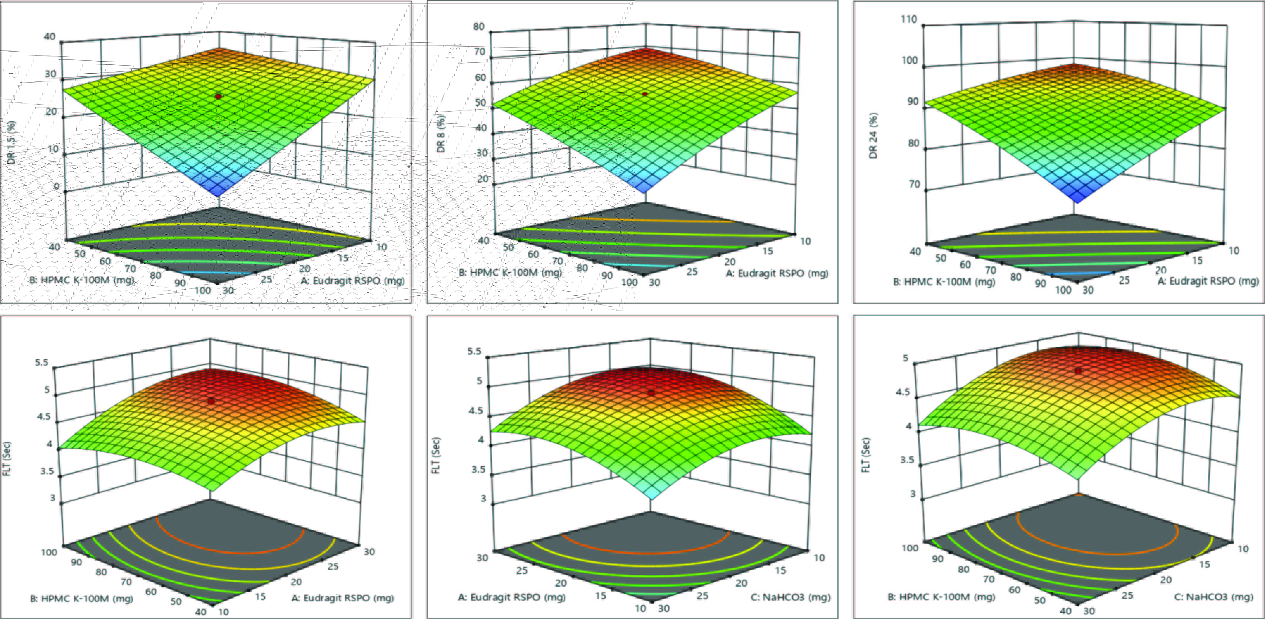 The amount of (A) and (B) have negative effects on DR1.5, DR8, and DR24 while positive effects on FLT. The amount of (C) has a positive effect on DR1.5, DR8, and DR24 and a negative effect on FLT. The effect of (A) on DR1.5, DR8 and DR24 were 1.2, 1.3 and 1.17 times more than the effect of (B), respectively. The interaction effect of (A) and (B) on all responses was found to be significant (p≤0.0500). Interaction of (A) and (B) was found negative for DR1.5, DR8 and DR24 while positive for FLT. Interaction of (A) and (C) was found negative for DR1.5, DR24 and FLT and positive for DR8. The effect of (A), (B) and (C) on DR1.5, DR8, DR24 and FLT were clearly understood by contour plot and 3D surface response plot as shown in fig. 5 and fig. 6. These graphs illustrated the amount of Eudragit RSPO and HPMC K-100M significantly affect the drug release in 1.5h, 8h and 24 h while the amount of NaHCO3 significantly affect the FLT.