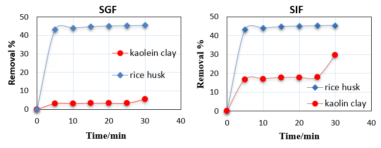 Results: The adsorption isotherms of type (S4, S2) were found on the surface of rice husks and kaolin clay type (L3, L4) in stomach and intestine fluids, respectively. On Iraqi kaolin clay, adsorption is well described by the pseudo-second-order model, and the Tempkin adsorption isotherm provides a good fit for the Stomach. Whereas adsorption on rice husk is well described by the Freundlich isotherm, which is a good fit for the intestine. the adsorption is predominantly physical. The best maximum adsorption capacities were calculated on both surfaces in the following order: stomach-kaolin>intestinal fluids-rice husks>stomach-rice husks>intestinal fluids-kaolin.
