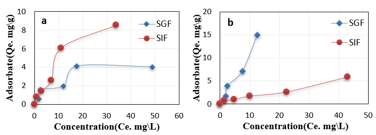 The adsorption equilibrium between liquid and solid heterogeneous surfaces is mathematically expressed by the term "isotherms." The assumption by langmuir was that a surface with only a small number of adsorption sites could only support monolayer uptake. According to a theory that has been put forth, as the number of binding sites increases, the site occupation by adsorbents decreases [32]. Langmuir plots had lower R2 values than SGF and SIF Freundlich, Langmuir, and Temkin plots, which meant that the model didn't fit the experimental data well.