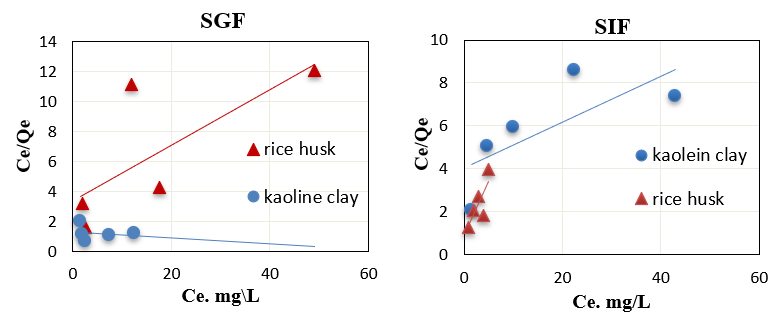 Fig. 4: Linear langmuir adsorption isotherm on rice husk and Iraqi kaolin clay in simulated SGF and SIF fluids