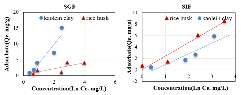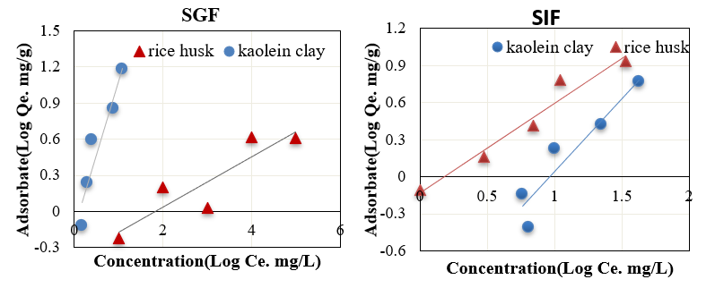 Fig. 5: Linear freundlich adsorption isotherm on rice husk and Iraqi kaolin clay in simulated SGF and SIF fluids