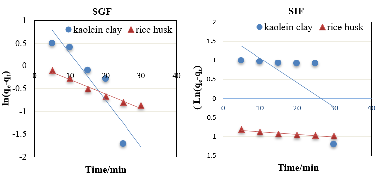 Fig. 7: Pseudo first-order straight equation for adsorption of ciprofloxacin on rice husks and kaolin at SGF and SIF