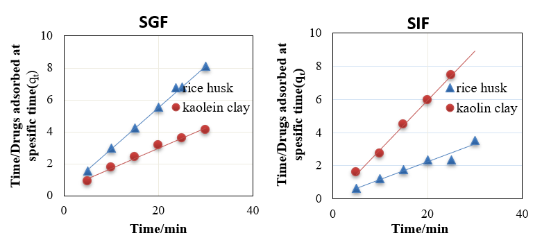 Methods: Ciprofloxacin adsorption from an aqueous solution was studied with respect to contact time, pH, and concentration. 30 min was determined to be the equilibrium time. Increasing the drug concentration on both adsorbents increased the adsorption rate, and the data fit well into a pseudo-second-order model. The solution concentration was analysed by UV-visible spectroscopy. Then the amount of adsorption was calculated, as well as the study of the reaction kinetics for both surfaces. The rice husk adsorbent showed faster removal with higher uptake than the Kaolin clay in both SGF and SIF solutions.