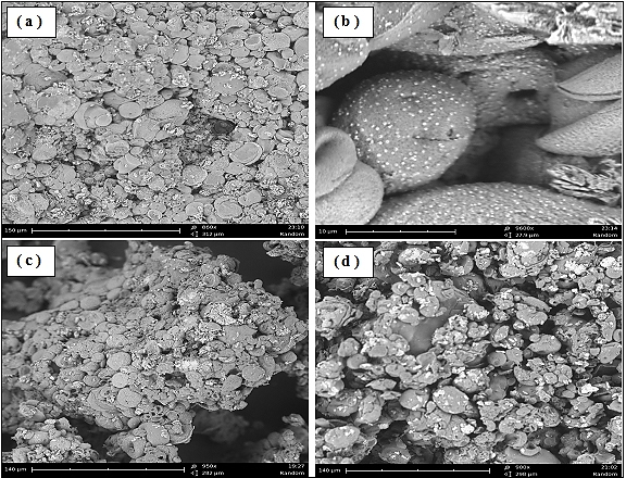 Fig. 2: SEM photographs of; (aandb) 1:0.25 w/w Alginate: GMO microspheres, (c) 1:0.5 w/w Alginate: GM O microspheres, (d) 1:1 w/w Alginate: GMO microspheres