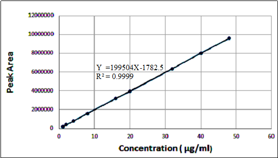 Fig. 3 shows a linear relationship between peak area and drug concentration at the concentration range 1-48 μg/ml (Famotidine/methanol) and λmax of 254 nm. The correlation coefficient was found to be 0.999 and the regression equation of y = 199504x–1782.5.